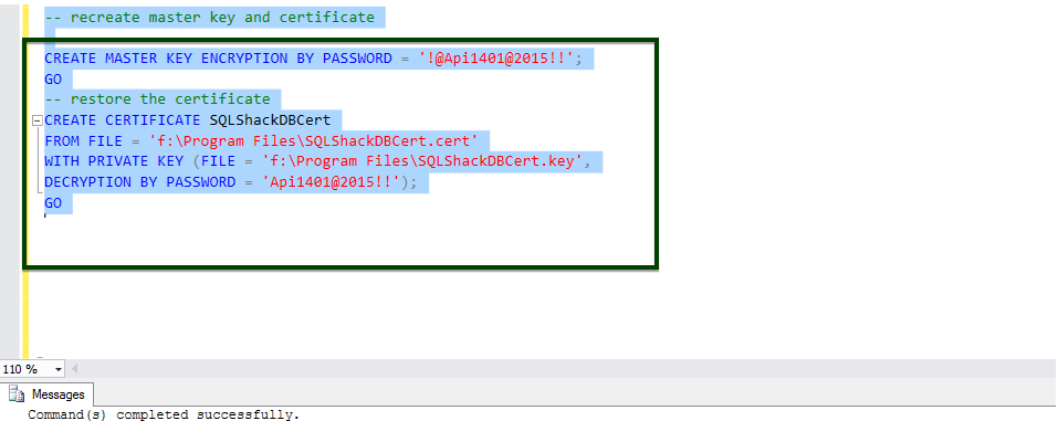 -- recreate master key and certificate CREATE MASTER KEY ENCRYPTION BY PASSWORD = '!@Api1401@2015!!'; GO -- restore the certificate CREATE CERTIFICATE SQLShackDBCert FROM FILE = 'f:\Program Files\SQLShackDBCert.cert' WITH PRIVATE KEY (FILE = 'f:\Program Files\SQLShackDBCert.key', DECRYPTION BY PASSWORD = 'Api1401@2015!!'); GO |