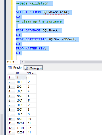 --Data validation SELECT * FROM SQLShackTable; GO -- clean up the instance DROP DATABASE SQLShack; GO DROP CERTIFICATE SQLShackDBCert; GO DROP MASTER KEY; GO |