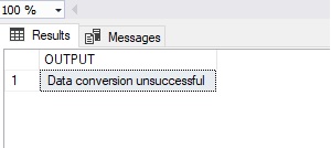 SELECT CASE WHEN TRY_CONVERT(INT, 'XYZ') IS NULL THEN 'Data conversion unsuccessful' ELSE 'Data converted successfully' END AS OUTPUT |