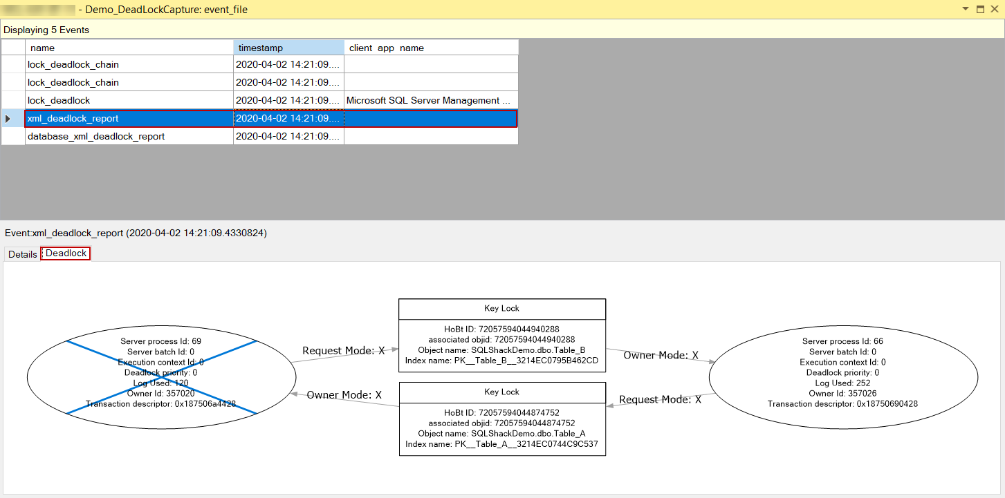 Also, in the xml_deadlock_report event, we can see the deadlock graph and it offers a virtual representation of the deadlock.