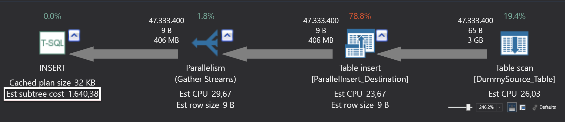 SET STATISTICS TIME ON TRUNCATE TABLE [ParallelInsert_Destination] SET STATISTICS TIME ON INSERT INTO [ParallelInsert_Destination] SELECT * FROM [DummySource_Table] SET STATISTICS TIME OFF |