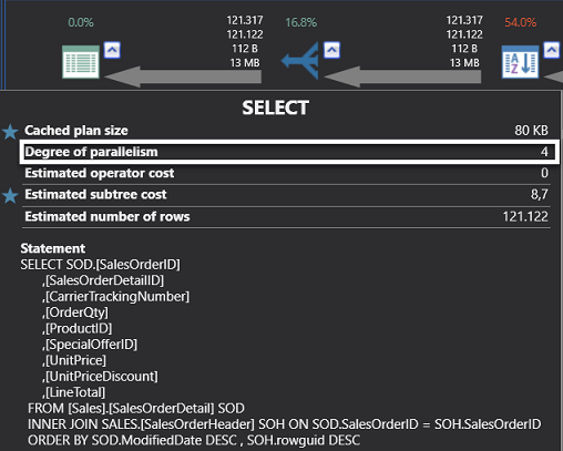 In the previous example, we can see parallel operators and as has been highlighted, Degree of Parallelism show us how many threads are used in this query.