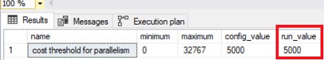exec sp_configure 'advanced',1 GO RECONFIGURE GO exec sp_configure 'cost threshold for parallelism', 5000; GO RECONFIGURE GO exec sp_configure 'cost threshold for parallelism' |