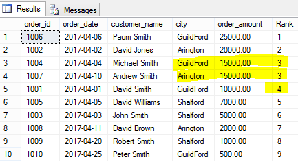 From the above image, you can see that the same rank (3) is assigned to two identical records (each having an order amount of 15,000) and it then skips the next rank (4) and assign rank 5 to next record.