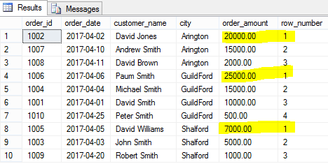 SELECT order_id,order_date,customer_name,city, order_amount, ROW_NUMBER() OVER(PARTITION BY city ORDER BY order_amount DESC) [row_number] FROM [dbo].[Orders] |