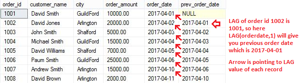 SELECT order_id,customer_name,city, order_amount,order_date, --in below line, 1 indicates check for previous row of the current row LAG(order_date,1) OVER(ORDER BY order_date) prev_order_date FROM [dbo].[Orders] |