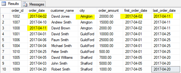 SELECT order_id,order_date,customer_name,city, order_amount, FIRST_VALUE(order_date) OVER(PARTITION BY city ORDER BY city) first_order_date, LAST_VALUE(order_date) OVER(PARTITION BY city ORDER BY city) last_order_date FROM [dbo].[Orders] |