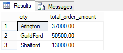SELECT city, SUM(order_amount) total_order_amount FROM [dbo].[Orders] GROUP BY city |