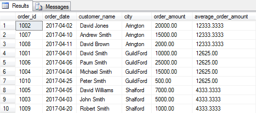SELECT order_id, order_date, customer_name, city, order_amount ,AVG(order_amount) OVER(PARTITION BY city, MONTH(order_date)) as average_order_amount FROM [dbo].[Orders] |
