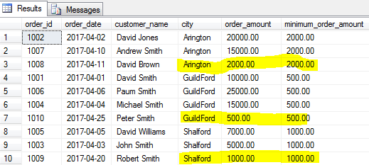 CREATE TABLE [dbo].[Orders] ( order_id INT, order_date DATE, customer_name VARCHAR(250), city VARCHAR(100), order_amount MONEY ) INSERT INTO [dbo].[Orders] SELECT '1001','04/01/2017','David Smith','GuildFord',10000 UNION ALL SELECT '1002','04/02/2017','David Jones','Arlington',20000 UNION ALL SELECT '1003','04/03/2017','John Smith','Shalford',5000 UNION ALL SELECT '1004','04/04/2017','Michael Smith','GuildFord',15000 UNION ALL SELECT '1005','04/05/2017','David Williams','Shalford',7000 UNION ALL SELECT '1006','04/06/2017','Paum Smith','GuildFord',25000 UNION ALL SELECT '1007','04/10/2017','Andrew Smith','Arlington',15000 UNION ALL SELECT '1008','04/11/2017','David Brown','Arlington',2000 UNION ALL SELECT '1009','04/20/2017','Robert Smith','Shalford',1000 UNION ALL SELECT '1010','04/25/2017','Peter Smith','GuildFord',500 |