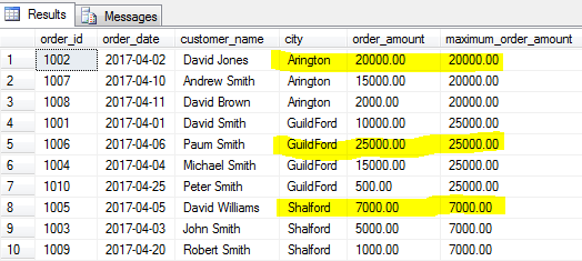 SELECT order_id, order_date, customer_name, city, order_amount ,MAX(order_amount) OVER(PARTITION BY city) as maximum_order_amount FROM [dbo].[Orders] |
