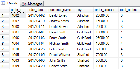 SELECT order_id, order_date, customer_name, city, order_amount ,COUNT(order_id) OVER(PARTITION BY city) as total_orders FROM [dbo].[Orders] |