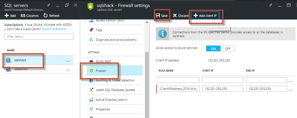 To enable the local machine with SSMS, in Azure Portal, click the SQL Server, go to Firewall and press Add client IP. This will add the local machine with SSMS. Once added, press Save:
