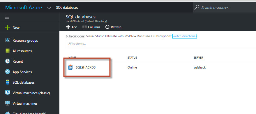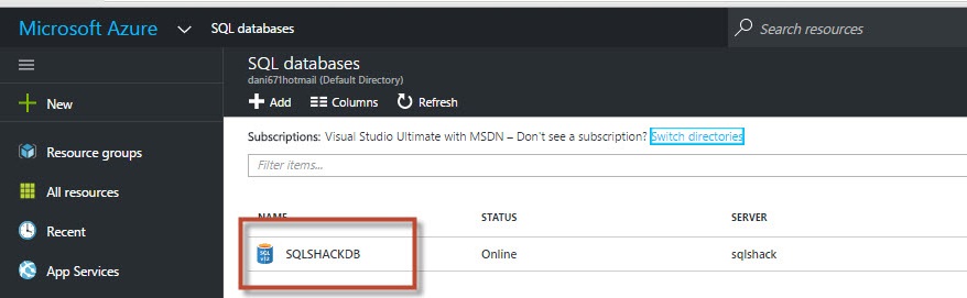 If everything is fine, in Azure Portal, in SQL Databases, you will be able to see the Database SQLSHACKDB created: