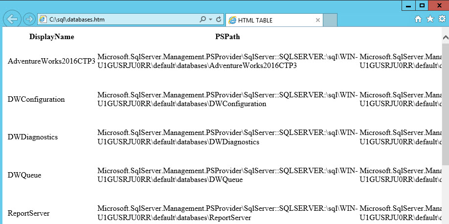 get-childitem | ConvertTo-HTML | Out-File C:\sql\databases.htm