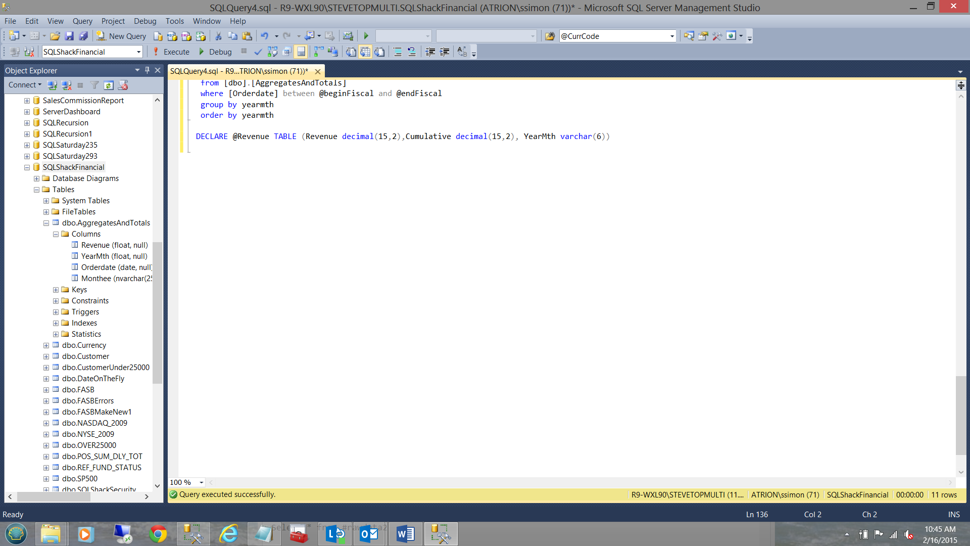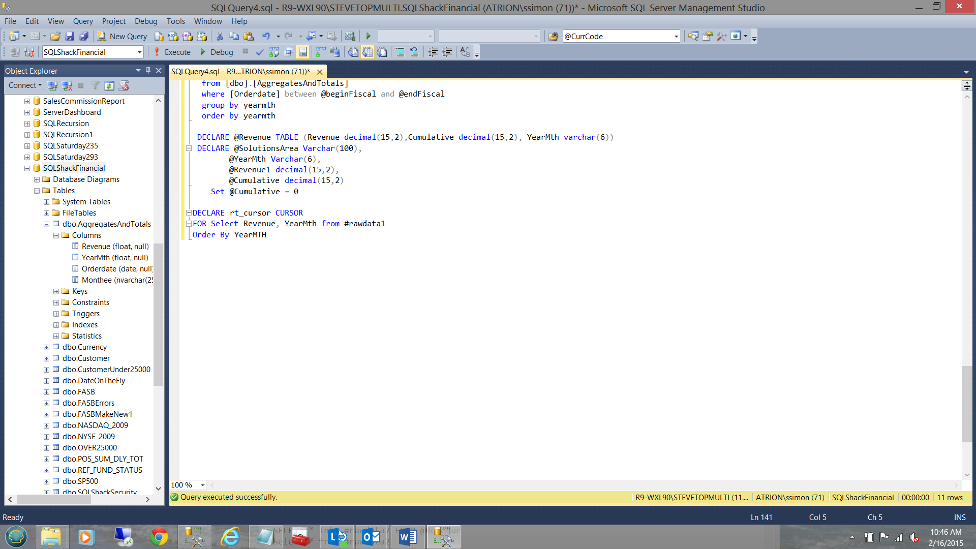 We note from the code snippet above, that with each iteration through the body of the cursor, @Cumulative is incremented by the current value of @Revenue1. The current YearMth, the current month’s revenue, and the cumulative revenue are all then inserted into our table variable.