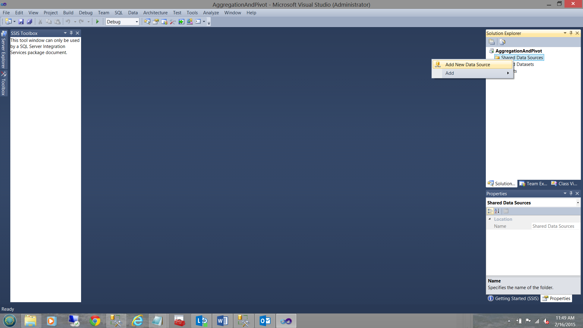 Our first task is to create a “Shared Data Source”. Right-clicking on the “Shared Data Sources” folder, we select “Add” and then “Add New Data Source” from the context menu.