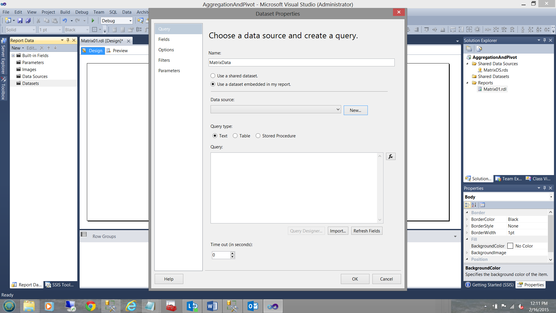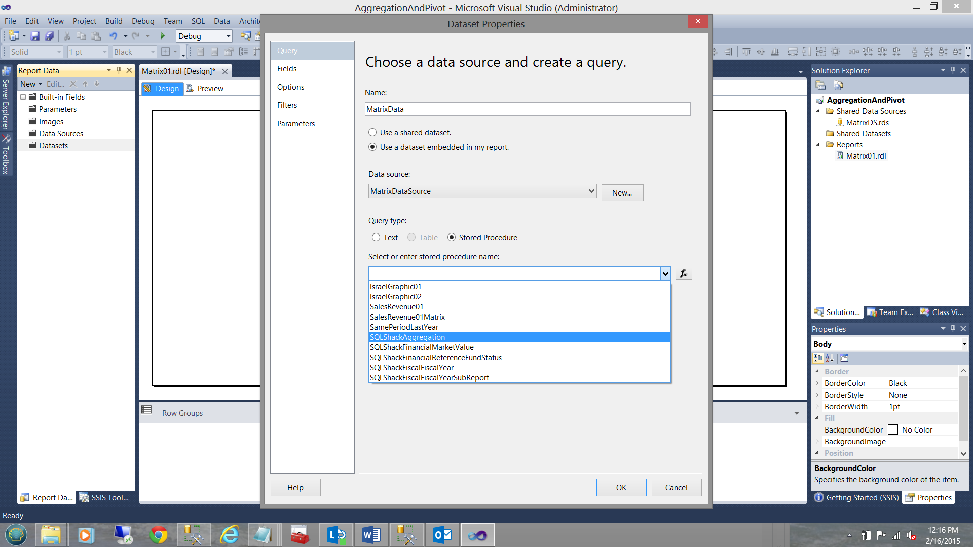We give our “Report Server Project” the name “AggregationAndPivot” (see above). We click OK to continue.