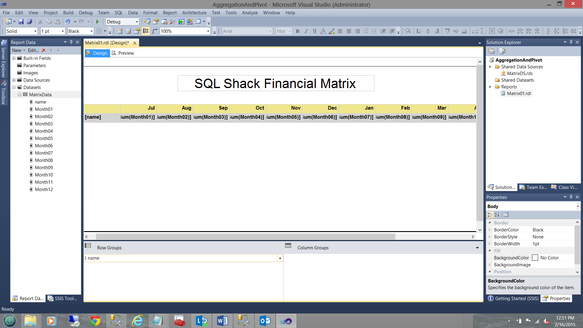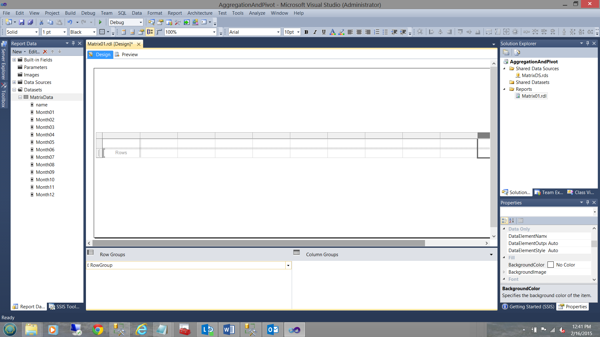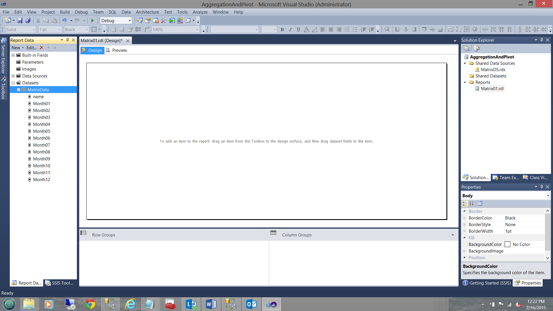 Bringing up SQL Server Data Tools, we are going to create a new Reporting Services project to display our data in a matrix format.