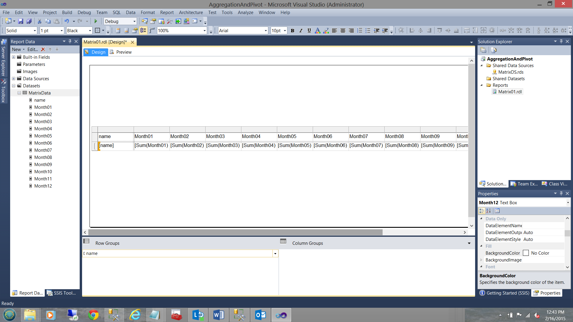 The format in which the data has been rendered (see above), whilst conducive to a chart or graph, is not conducive to populating a Reporting Services matrix. This said we must massage the data utilizing a pivot construct (see below).