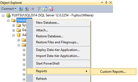 - In SQL Server Management Studio, connect to the SQL Server instance you want to generate the report for. Note that even if the report is created for one SQL Server instance (e.g. Fujitsu\SQL2014 in this example), if you connect to a different instance (e.g. Fujitsu\SQL2012), the later instance will be queried and the report will contain its data, so you will get different reports, depending on the context used. In other words, you can use the same report on all your SQL Server databases and instances, as long as queried objects exist in them. If you want to avoid this behavior and execute a report only against a specific database, regardless the database connected to, add the USE statement at the beginning of the query