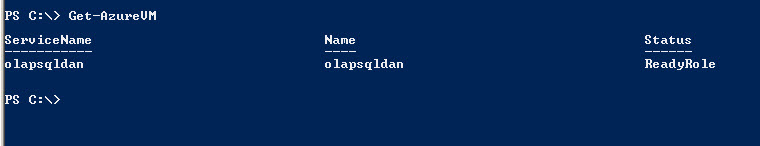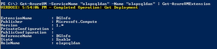 Get-AzureVM –ServiceName "olapsqldan" -Name "olapsqldan" | Get-AzureVMExtension