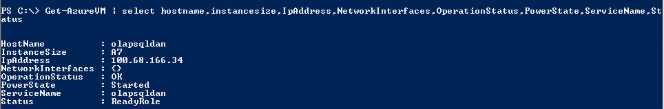 Get-AzureVM | select hostname,instancesize,IpAddress,NetworkInterfaces,OperationStatus, PowerSate, ServiceName,Status