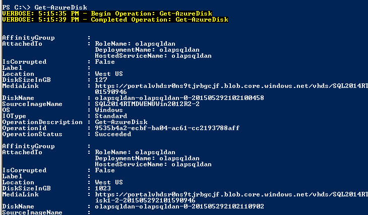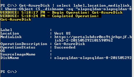 Get-AzureDisk | select label,location,medialink,operationdescription,operationstatus,OS,sourceimagename,diskname| Where-Object {$_.diskname –eq "olapsqldan-olapsqldan-8-201505292102250296"}