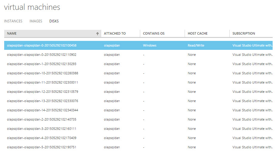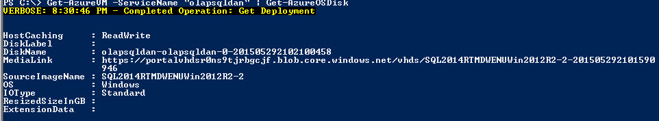 Get-AzureVM –ServiceName “olapsqldan” | Get-AzureOSDisk