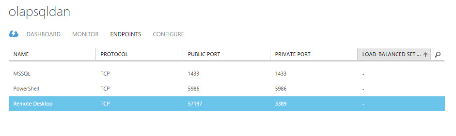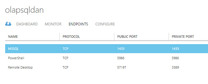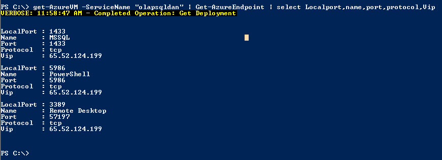 get-AzureVM –ServiceName “olapsqldan” | Get-AzureEndpoint | select Localport,name,port,protocol,Vip