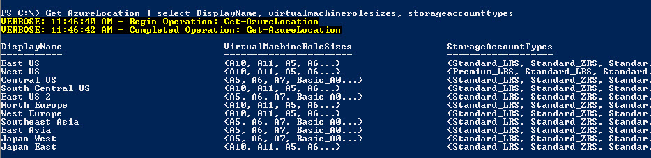 Get-AzureLocation | select DisplayName, virtualmachinerolesizes, storageaccounttypes