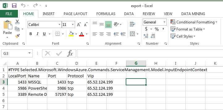 get-AzureVM –ServiceName “olapsqldan” | Get-AzureEndpoint | select Localport,name,port,protocol,Vip| Export-Csv c:\scripts\export.csv