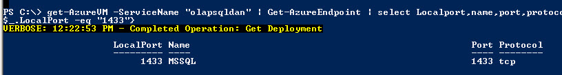 get-AzureVM –ServiceName “olapsqldan” | Get-AzureEndpoint | select Localport,name,port,protocol | Where-Object {$_.LocalPort –eq "1433"}