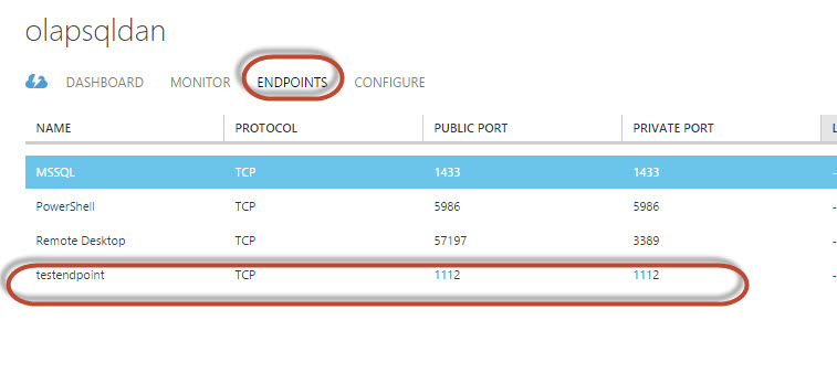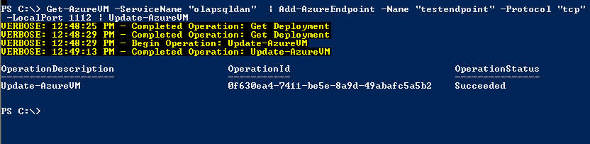 Get-AzureVM –ServiceName "olapsqldan" | Add-AzureEndpoint -Name "testendpoint" -Protocol "tcp" –PublicPort 1112 –LocalPort 1112 | Update-AzureVM