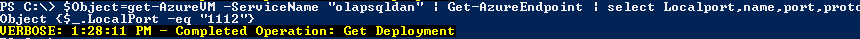 $Object=get-AzureVM –ServiceName “olapsqldan” | Get-AzureEndpoint | select Localport,name,port,protocol | Where-Object {$_.LocalPort –eq "1112"}