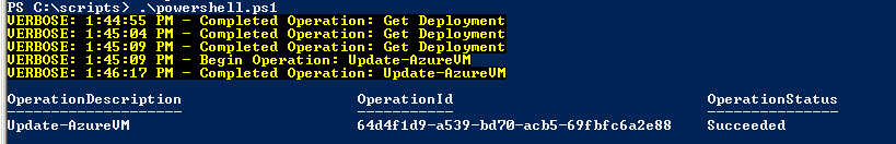 Figure 2. The Get-AzureVM cmdlet. By default, it shows the active VMs, the name and status of Azure VMs. You can verify in the Azure Portal the VM names: