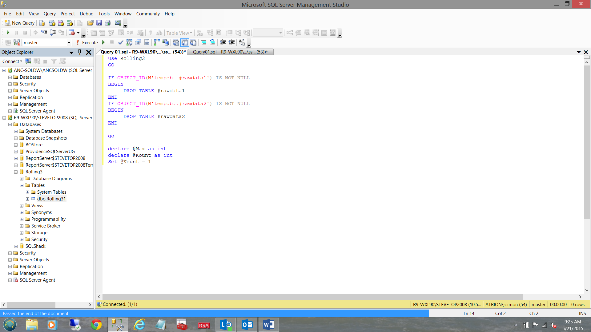 As may be seen in the screenshot above, we have done something a bit unorthodox by creating a temporary table called #rawdata2. Creating the temporary table at this point requires a bit of explanation.