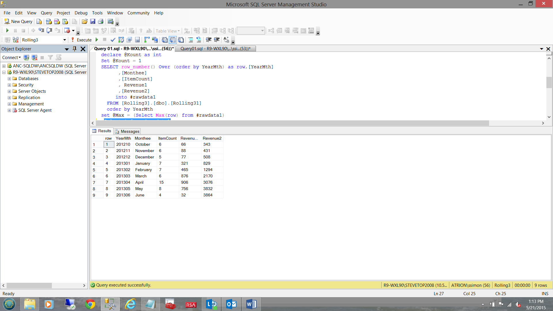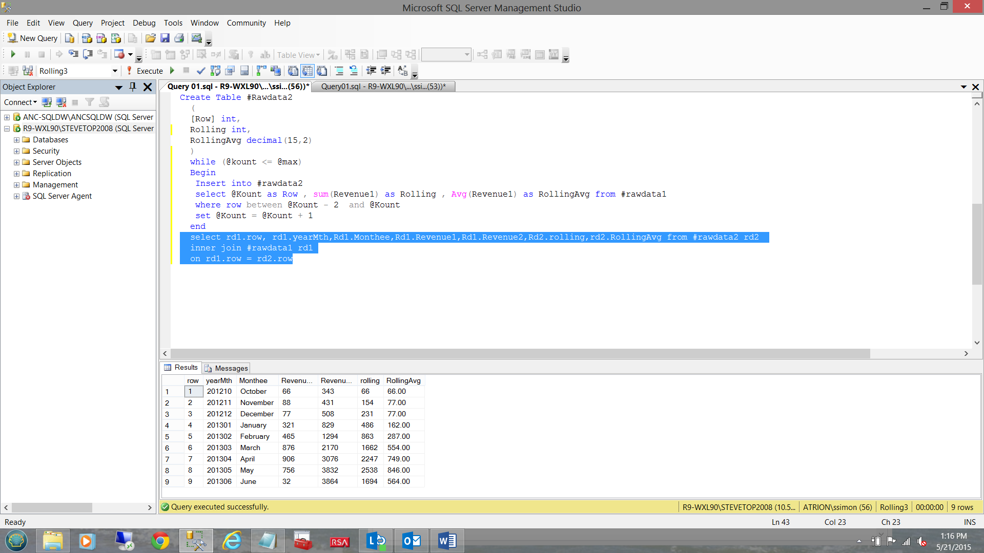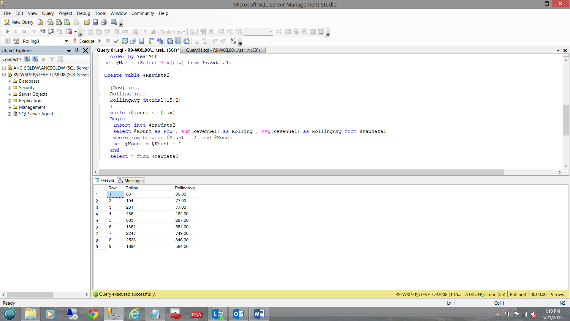 Use Rolling3 GO IF OBJECT_ID(N'tempdb..#rawdata1') IS NOT NULL BEGIN DROP TABLE #rawdata1 END IF OBJECT_ID(N'tempdb..#rawdata2') IS NOT NULL BEGIN DROP TABLE #rawdata2 END go declare @Max as int declare @Kount as int Set @Kount = 1 SELECT row_number() Over (order by YearMth) as row,[YearMth] ,[Monthee] ,[ItemCount] , Revenue1 ,[Revenue2] into #rawdata1 FROM [Rolling3].[dbo].[Rolling31] order by YearMth set @Max = (Select Max(row) from #rawdata1) Create Table #Rawdata2 ( [Row] int, Rolling int, RollingAvg decimal(15,2) ) while (@kount <= @max) Begin Insert into #rawdata2 select @Kount as Row , sum(Revenue1) as Rolling , Avg(Revenue1) as RollingAvg from #rawdata1 where row between @Kount - 2 and @Kount set @Kount = @Kount + 1 end select rd1.row, rd1.yearMth,Rd1.Monthee,Rd1.Revenue1,Rd1.Revenue2,Rd2.rolling,rd2.RollingAvg from #rawdata2 rd2 inner join #rawdata1 rd1 on rd1.row = rd2.row |