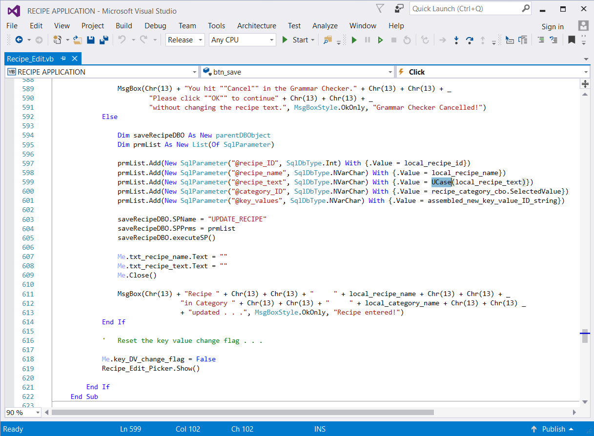 For this article, we’ll work with a VB.net desktop application that I built for a customer. The application handles recipe management. The user sees a presentation layer that front-ends a locally hosted, completely relational SQL Server 2014 Enterprise database. First, we’ll see a bug in the Application Recipe Edit Module. Then, we’ll use the SQL Server Extended Events tool to understand and fix the bug.