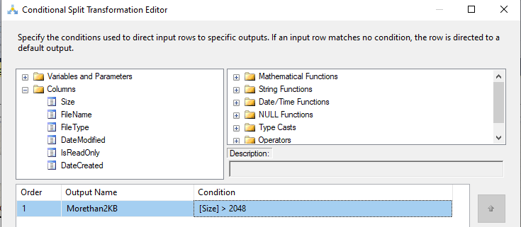 After the script component is configured, typical data flow tasks can be used. For example, let us say we want to split the data set, depending on the size of the file.