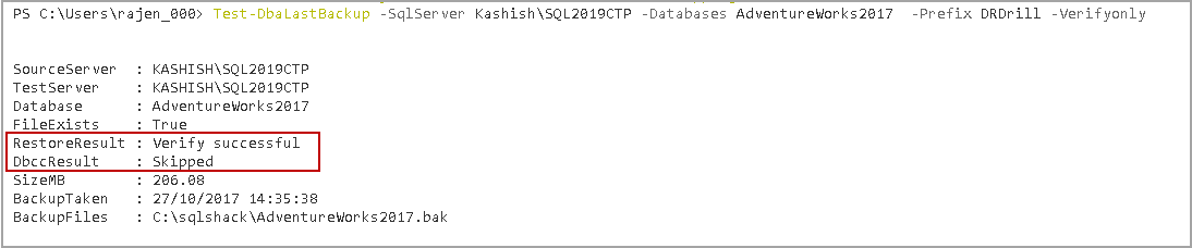 >Test-DbaLastBackup -SqlServer Kashish\SQL2019CTP -Databases AdventureWorks2017 -Prefix DRDrill -NoDrop -DataDirectory C:\TEMP\Backup -LogDirectory C:\TEMP\Backup |