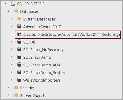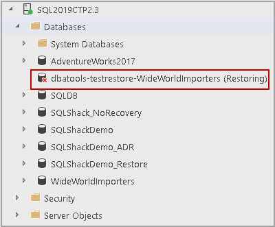 While restoration is in progress, right-click on the databases and refresh it. You can see a new database in the format of dbatools-testrestore-$databaseName. This database will be in restoring mode. In the following screenshot, you can see database restoration is going on for WideWorldImporters database.