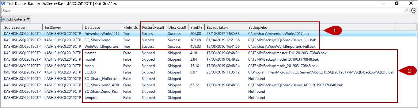 For example, we took AdventureWorks017 database backup in C:\SqlShack folder and SQLShackDemo database backup in C:\Temp folder. We can see the last backup location in BackupFiles column. It restores database SQL Server on the specified instance and performs validation checks.