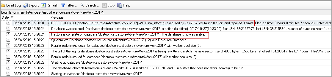 In the previous example, we did not specify any database name for restoration and validation check. Suppose we want to perform validation test for a particular database. We can specify database name using -Databases parameter. In the following query, we want to perform a SQL restore database operation for consistency check for AdventureWorks2017 database.