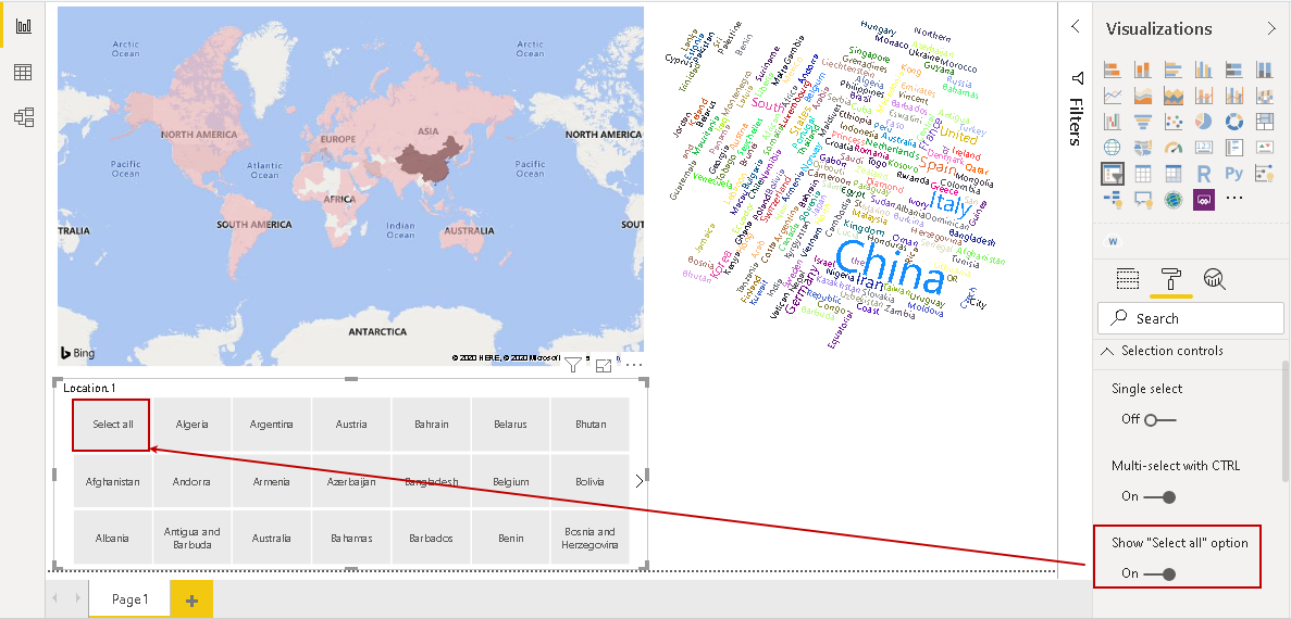 Add a Select all selection tile. By default, the slicer does not show select all selection tile. It is a good practice so we can look at all countries’ data together