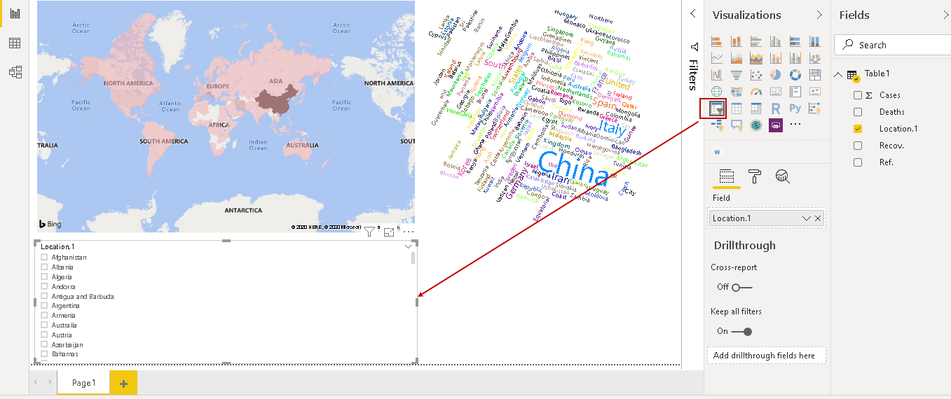 We might want to look at data for a specific country. It might not be feasible for you to search on the map for a specific country. We can add a slicer visual for this purpose. Click on a slicer and drag the location column in the slicer data column. You get the following visuals.