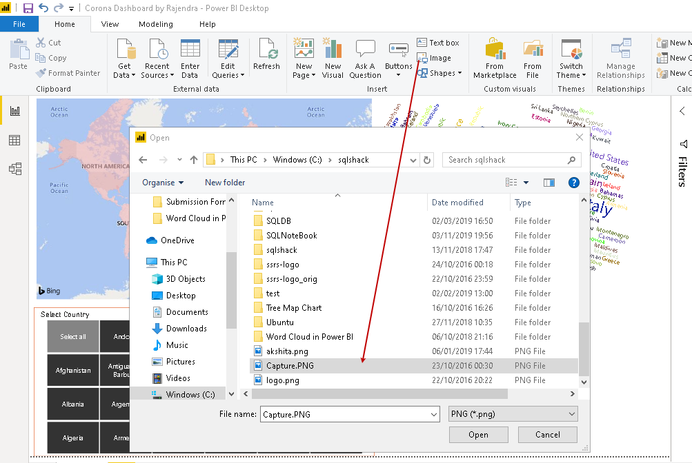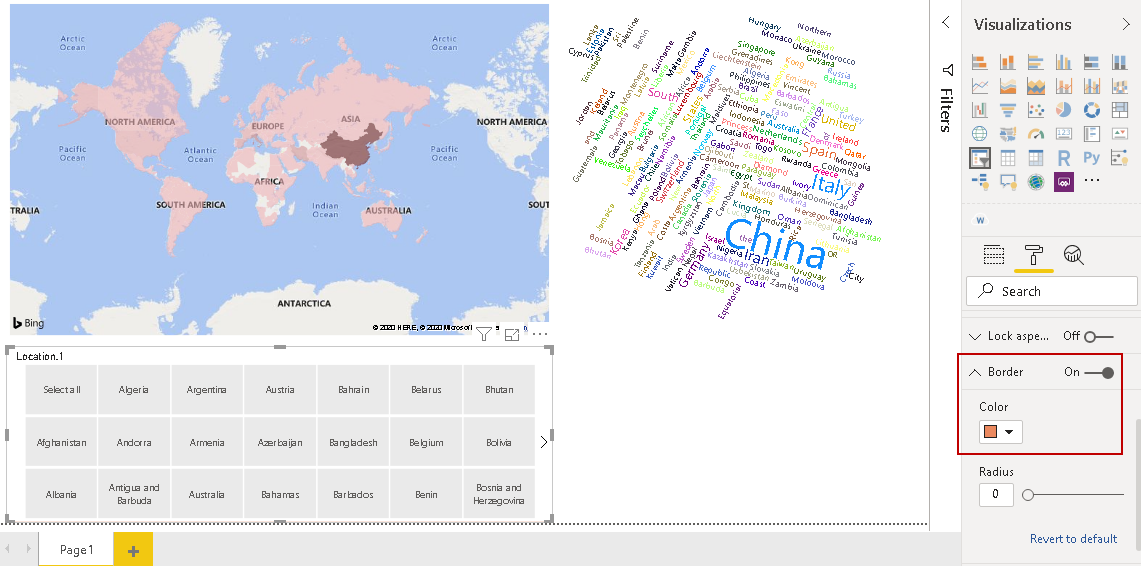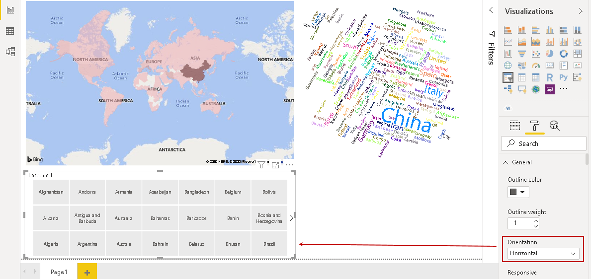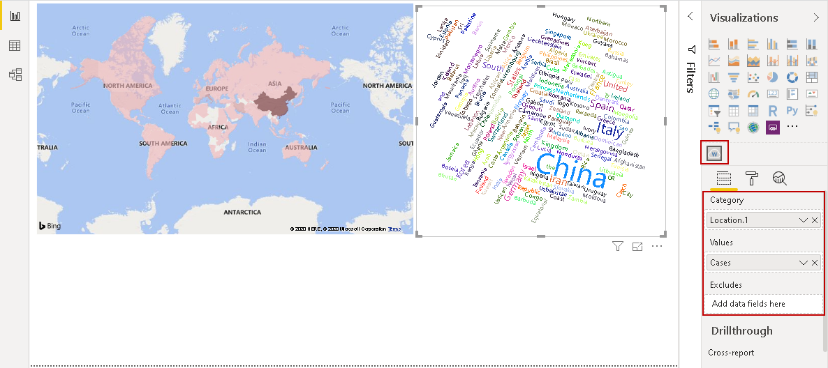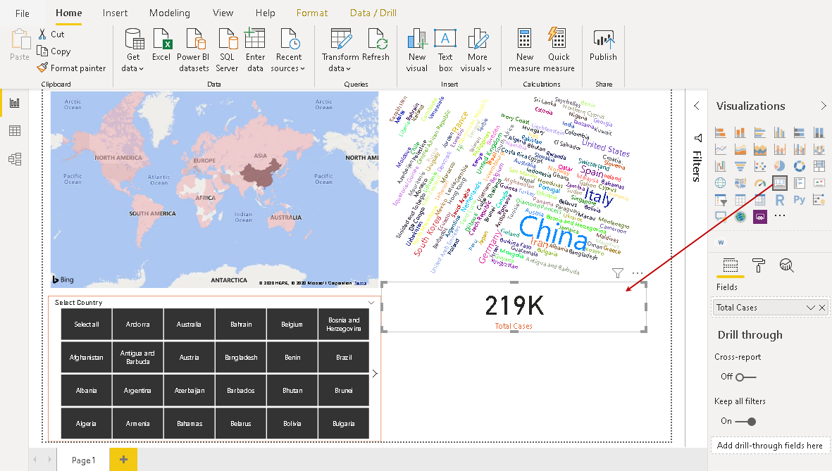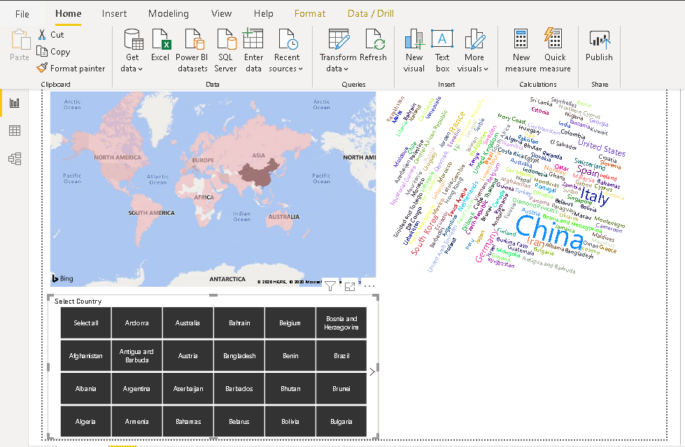 In the next step, we add a Word Cloud in this visual. You can refer to the article How to create a Word Cloud generator in Power BI Desktop. Word Cloud shows impacted countries based on total cases. Here, we see the largest font size for China as per the total reported cases.