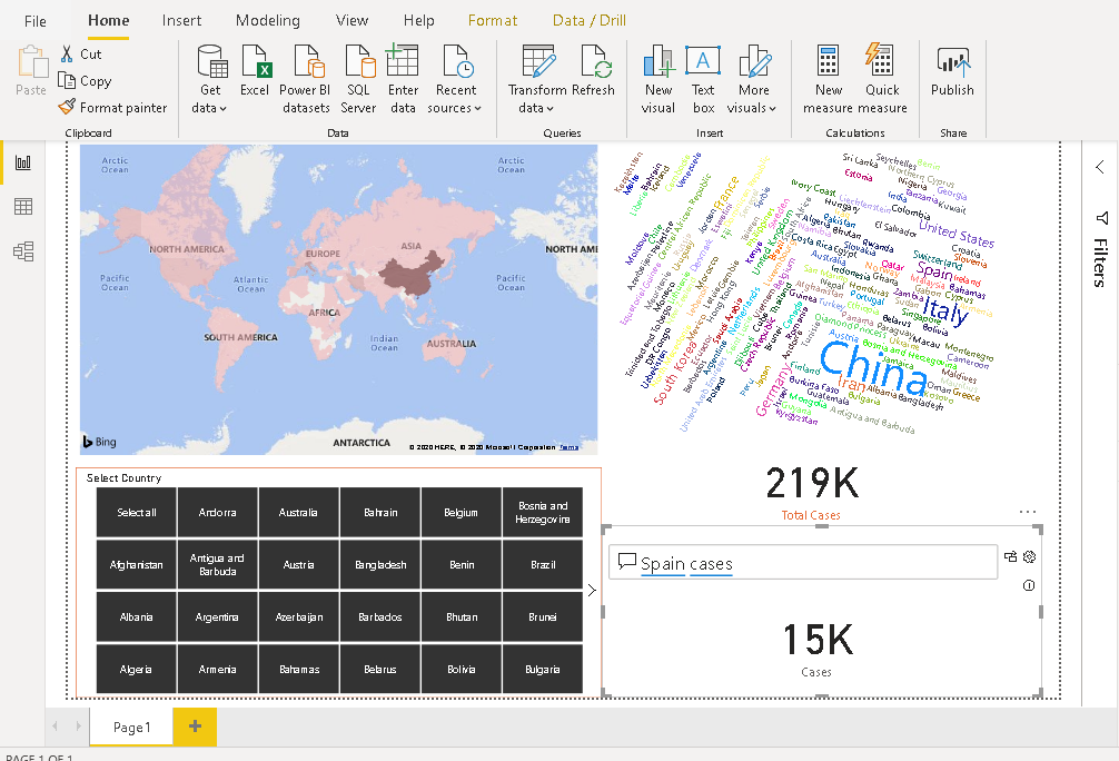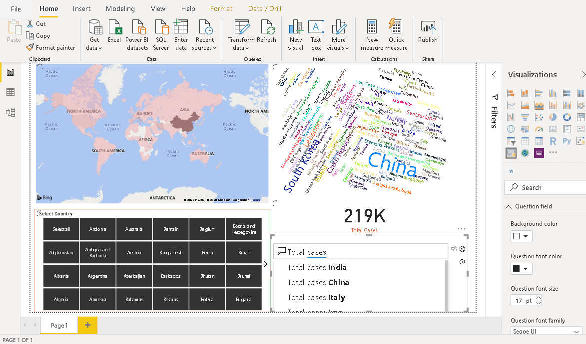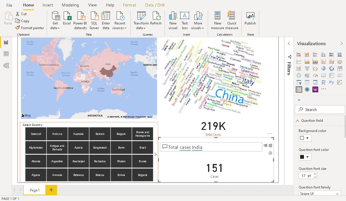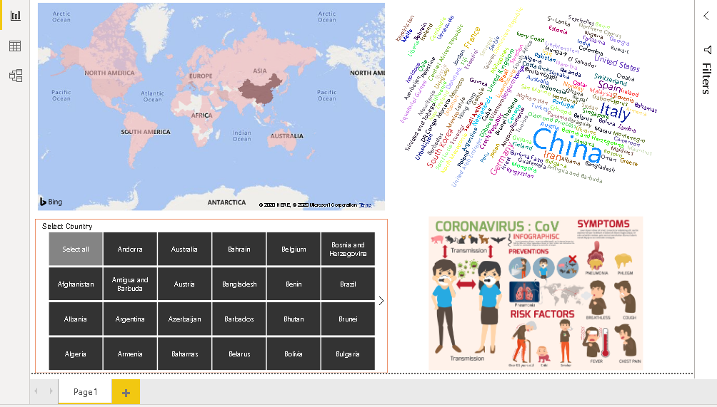 This article demonstrates Power BI visuals for visualizing Coronavirus impact worldwide using various visuals such as a filled map, Word Cloud, Slicer, Q&A.