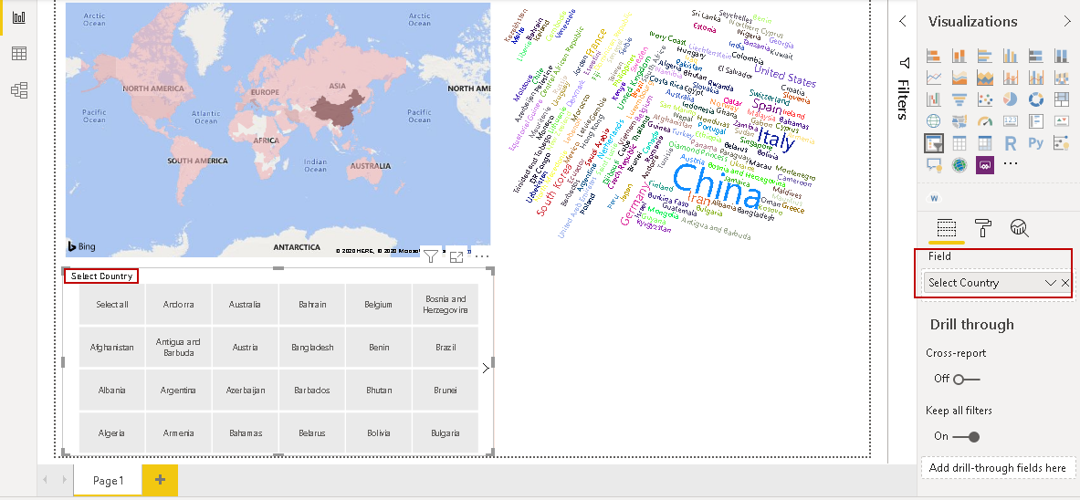 Now, click on Select all tile and it moves back to the original state showing all countries data in both Word cloud and Maps visual.