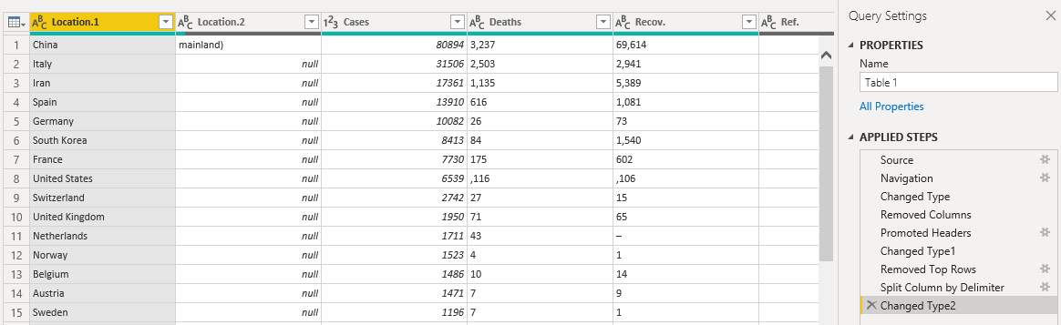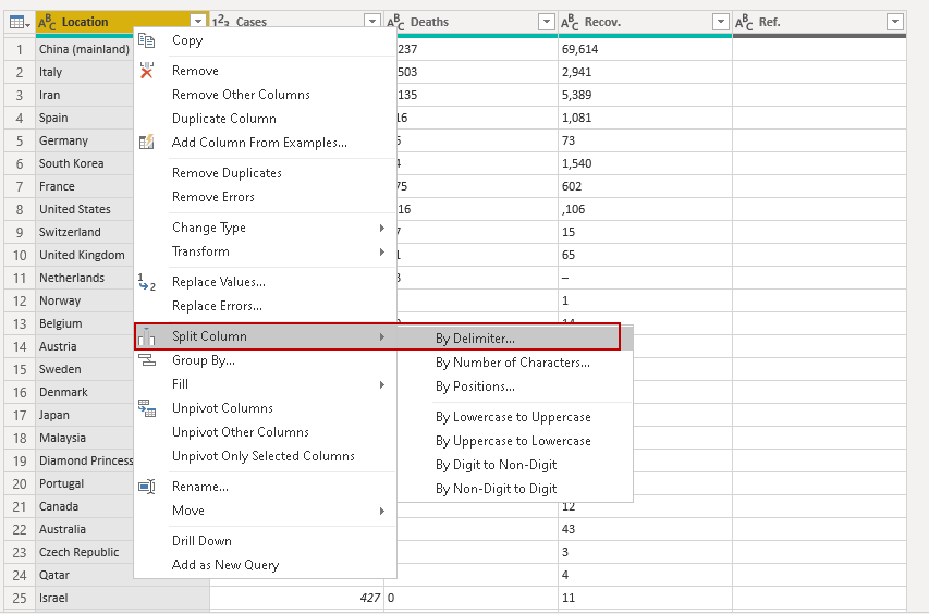 In the Location field, we have a few countries with the name in small brackets () as well. Let’s eliminate the small brackets text as well. Right-click on the Location column and select Split Column-> By Delimiter.